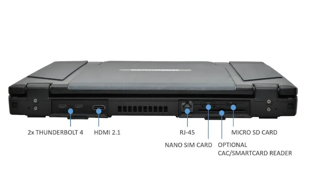 The unit leads the market with dual Thunderbolt™ 4, dual RJ-45 ports, dual SIM (one Nano SIM slot & one eSIM), up to three USB 3.2 ports, HDMI 2.1 and microSD card slot. Further customization options abound with up to two RS-232 serial ports, smart card reader and ExpressCard 54.