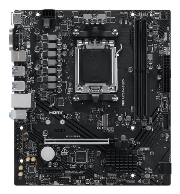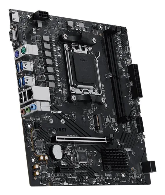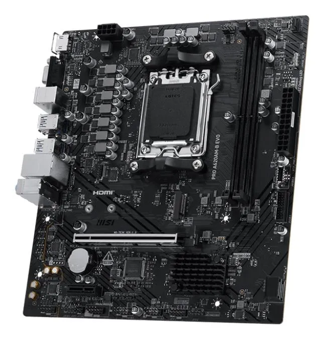 | Summary | MSI PRO A620AM-B EVO. Processor manufacturer: AMD, Processor socket: Socket AM5, Compatible processor series: AMD Ryzen 7000 Series, AMD Ryzen 8000 Series, AMD Ryzen 9000 Series. Supported memory types: DDR5-SDRAM, Maximum internal memory: 128 GB, Memory slots type: DIMM. Supported storage drive interfaces: M.2, SATA III. Ethernet interface type: 5 Gigabit Ethernet. Component for: PC, Motherboard form factor: ATX, Motherboard chipset family: AMD |