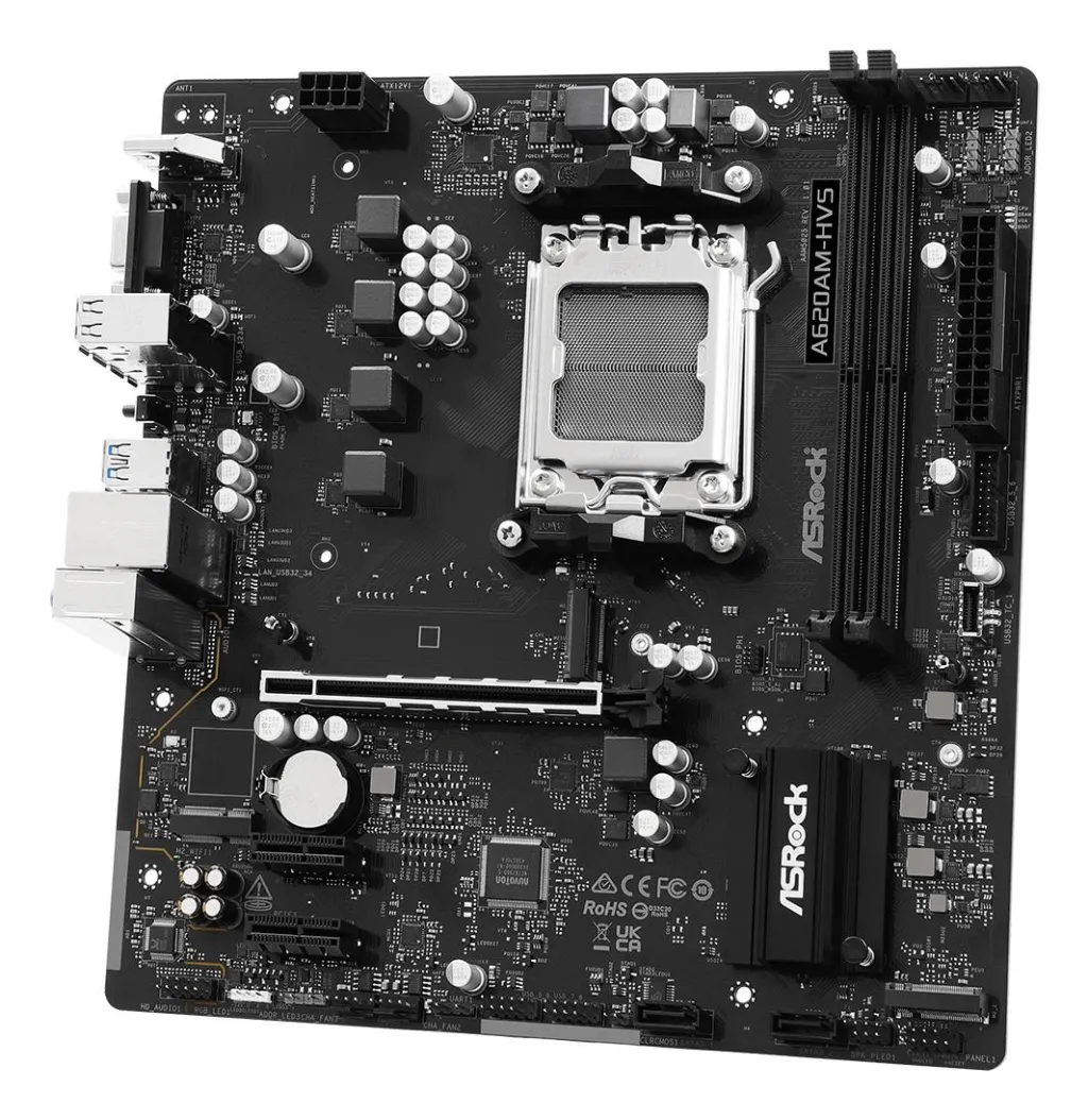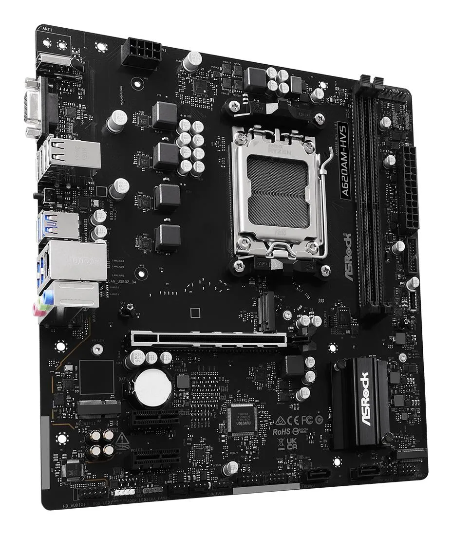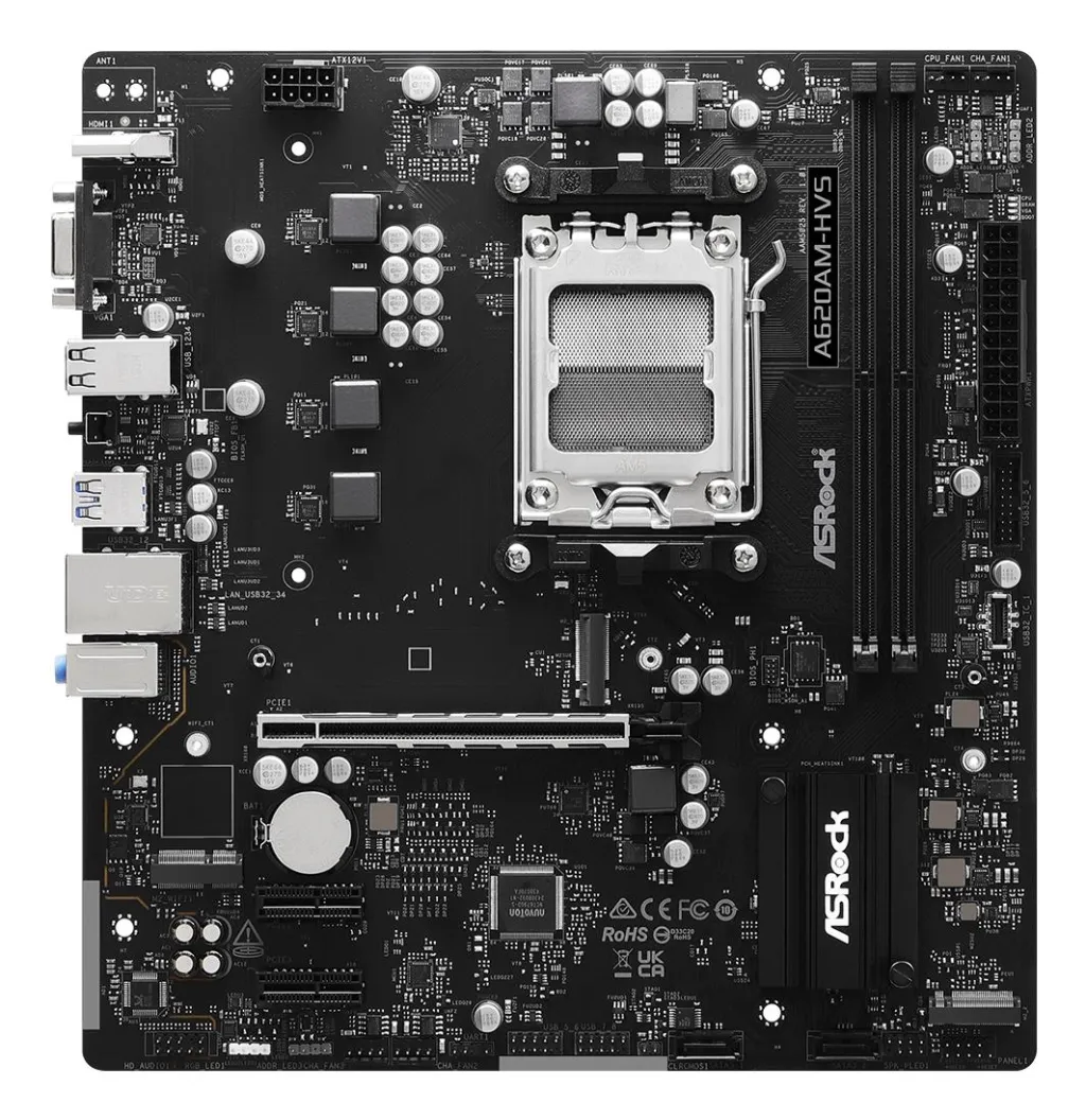 | Summary | Asrock A620AM-HVS. Processor manufacturer: AMD, Processor socket: Socket AM5, Compatible processor series: AMD Ryzen 7000 Series, AMD Ryzen 8000 Series, AMD Ryzen 9000 Series. Supported memory types: DDR5-SDRAM, Maximum internal memory: 128 GB, Memory slots type: DIMM. Supported storage drive interfaces: PCI Express 3.0, PCI Express 4.0, SATA III, Supported storage drive types: HDD & SSD, RAID levels: 0, 1, 10. Maximum resolution: 3840 x 2160 pixels. USB connector type: USB Type-A |