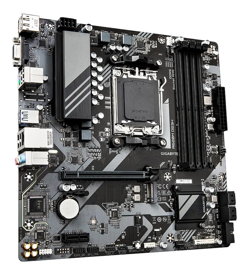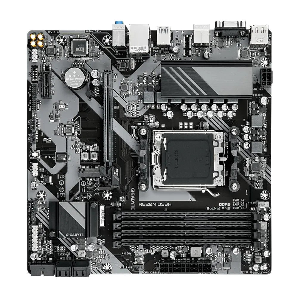 | Summary | GIGABYTE A620M DS3H Motherboard - Supports AMD Ryzen 8000 CPUs, 5+2+2 Phases Digital VRM, up to 7600MHz DDR5 (OC), 1xPCIe 4.0 M.2, GbE LAN, USB 3.2 Gen 1. Processor manufacturer: AMD, Processor socket: Socket AM5, Compatible processor series: AMD Ryzen 7000 Series. Supported memory types: DDR5-SDRAM, Maximum internal memory: 192 GB, Memory slots type: DIMM. Supported storage drive interfaces: M.2, SATA III, Supported storage drive types: HDD & SSD, RAID levels: 0, 1, 10. Maximum resolution: 4096 x 2160 pixels. USB connector type: USB Type-A, USB Type-C |