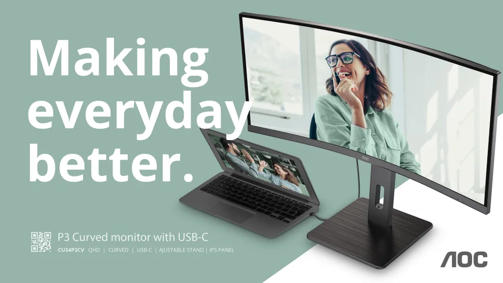 AOC CU34P3CV. Ekraani diagonaal: 86,4 cm (34"), Ekraani resolutsioon: 3440 x 1440 pikslit, HD tüüp: UltraWide Quad HD, Ekraani tehnoloogia: LED, Reaktsiooniaeg: 4 ms, Loomulik kuvasuhe: 21:9, Vaatenurk, horisontaalne: 178°, Vaatenurk, vertikaalne: 178°. Sisseehitatud kõlar(id). Sisseehitatud USB-jaotur, USB-jaoturi versioon: 3.2 Gen 1 (3.1 Gen 1). VESA paigaldamine, Kõrguse reguleerimine. Toote värv: Must