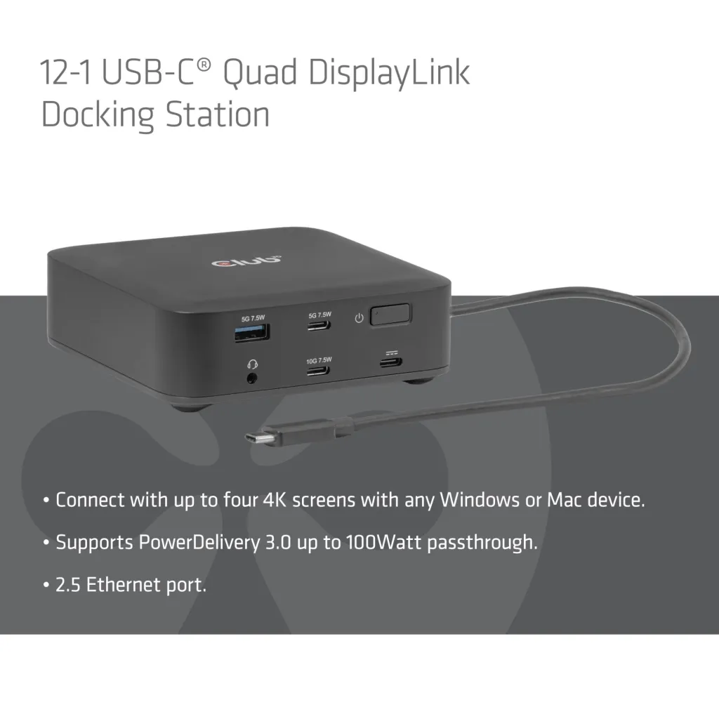 | Summary | CLUB3D CSV-2542 12-1 USB-C® Quad DisplayLink Docking Station 2x Display- Port™ 8K60Hz + 2x HDMI™ 4K60Hz PD3.0 100Watt Ethernet 2.5G. Connectivity technology: Docking, Host interface: USB 3.2 Gen 2 (3.1 Gen 2) Type-C, USB Power Delivery up to: 100 W. Ethernet LAN data rates: 10,100,1000,2500 Mbit/s. Product colour: Black, Data transfer rate: 10 Gbit/s, HD type: 8K Ultra HD. Windows operating systems supported: Windows 11, Mac operating systems supported: Mac OS X 15.0 Sequoia. Width: 110 mm, Depth: 110 mm, Height: 35 mm |