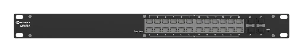 | Summary | Teltonika SWM282. Switch type: Managed, Switch layer: L2+. Basic switching RJ-45 Ethernet ports type: Gigabit Ethernet (10/100/1000), Basic switching RJ-45 Ethernet ports quantity: 24. MAC address table: 8000 entries, Switching capacity: 56 Gbit/s. Networking standards: IEEE 802.3i, IEEE 802.3u, IEEE 802.3ab, IEEE 802.3x, IEEE 802.3az, IEEE 802.1x, IEEE 802.3af, IEEE.... Power connector: AC-in jack. Power over Ethernet (PoE). Rack mounting |