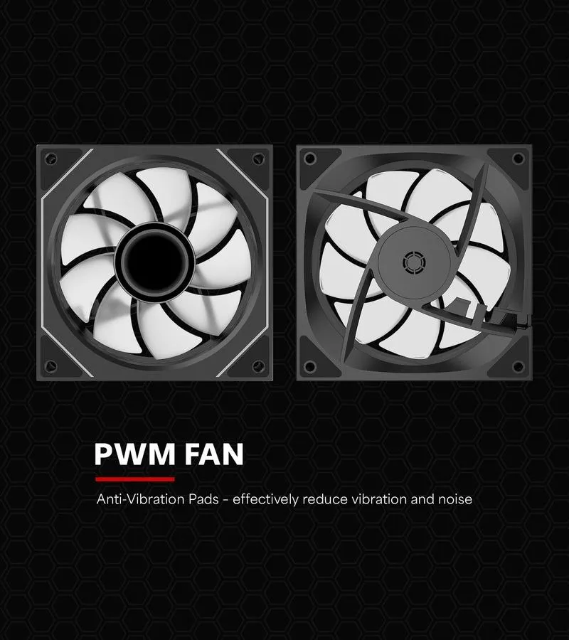 The nine-blade fan design with PWM control automatically regulates the speed between 500 and 1800 rpm, ensuring a balance between cooling performance and quiet operation.