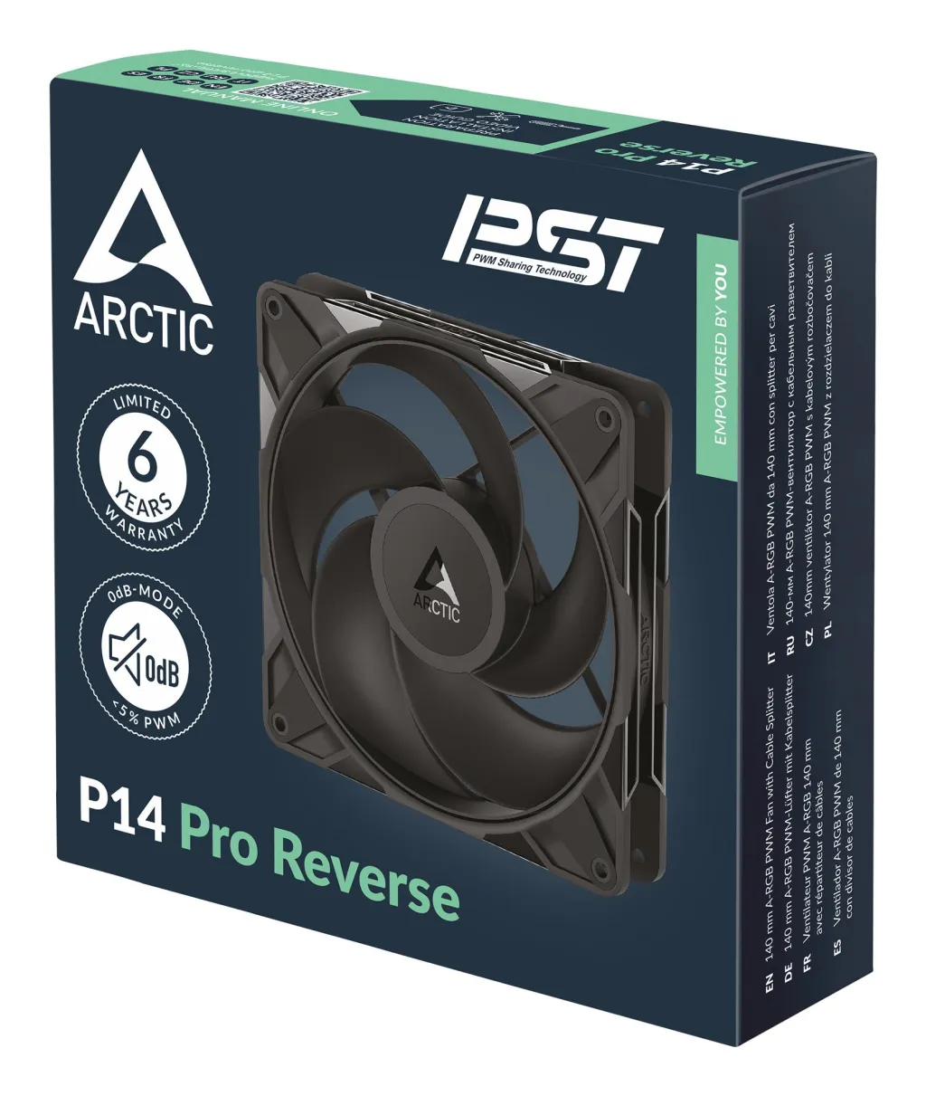 | Summary | ARCTIC Freezer P14 Pro Reverse - 3 Pack - 140 mm A-RGB PWM Fan with Cable Splitter. Type: Fan, Fan diameter: 14 cm, Airflow: 166.5 m³/h, Maximum air pressure: 5.1 mmH2O, Bearing type: Fluid Dynamic Bearing (FDB). Product colour: Black |
