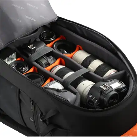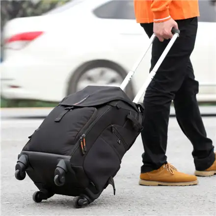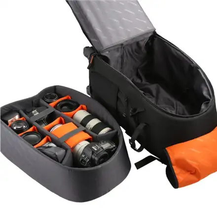 2-in-1 trolley with removable inner box Handle type Single handle ● Four-wheel trolley makes horizontal movement available Shoulder strap type Fixed ● Full harness system with easy conversion allows user to carry it as backpack INTERNAL ● 3-stop trolley makes it easy to get the desired working length Function Yes ● Large capacity carries a complete gear set for the pros Divider Yes ● Holds 14'' wide screen laptop plus tablet like iPad Divider quantity 10 ● Tripod carrying system FEET No ● Specially designed flexible wheel cover when carry as backpack Quantity 0 ● Full front opening with 2 side straps Material ● Multiple accessory pockets well stow the necessities Trolley Yes ● Bonus cell phone holder and accessory pouch Sections 3 ● Water resistant, washable material on bottom LOGO Yes ● Hanging system to bring extras Logo color Black/Grey/Orange ● Name card holder Logo material Silicone ● Rain cover included