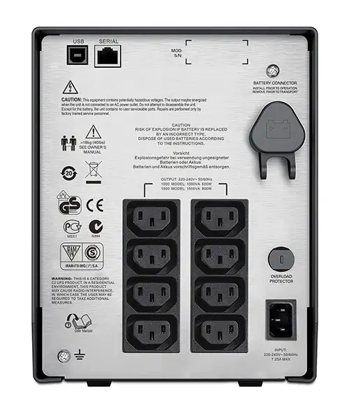 APC Smart-UPS. Väljundvõimsuse potentsiaal: 1000 VA, Väljundvõimsus: 600 W, Sisendi tööpinge (minimaalne): 170 V. AC-väljundi tüüp: C13 pistikut, AC-väljundite arv: 8 vahelduvvoolu kontakt. Akutehnoloogia: Suletud pliiaku (VRLA), Aku laadimisaeg: 3 h, Tüübipärane varundamisaeg poole koormusega: 16,3 min. Toote värv: Must, Ekraan: LCD. Puhvertoiteallika topoloogia: Liini-interaktiivne, Lainekuju: Siinus, Müratase: 41 dB
