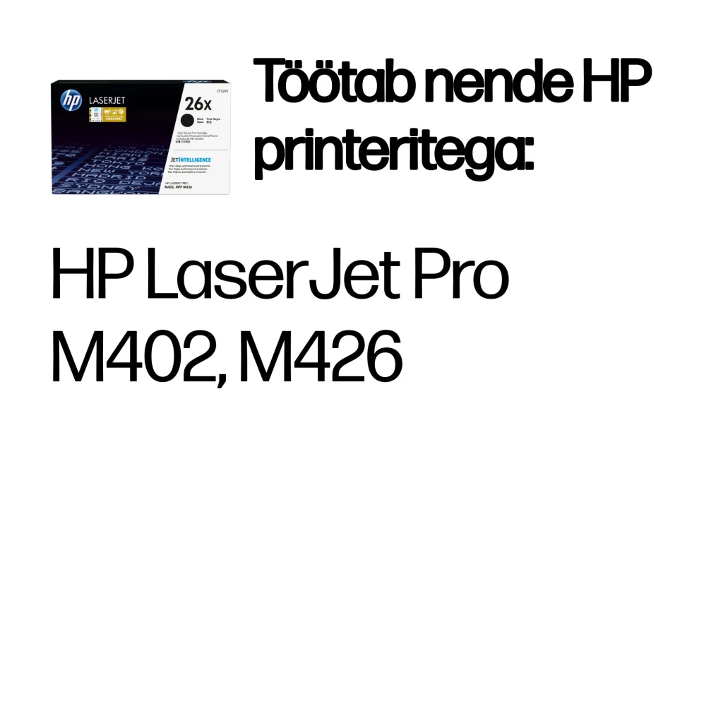 HP 26X High Yield Black Original LaserJet Toner Cartridge. Musta toonerkasseti prinditavate lehekülgede arv: 9000 lehekülge, Printimisvärvid: Must, Kogus pakis: 1 tk