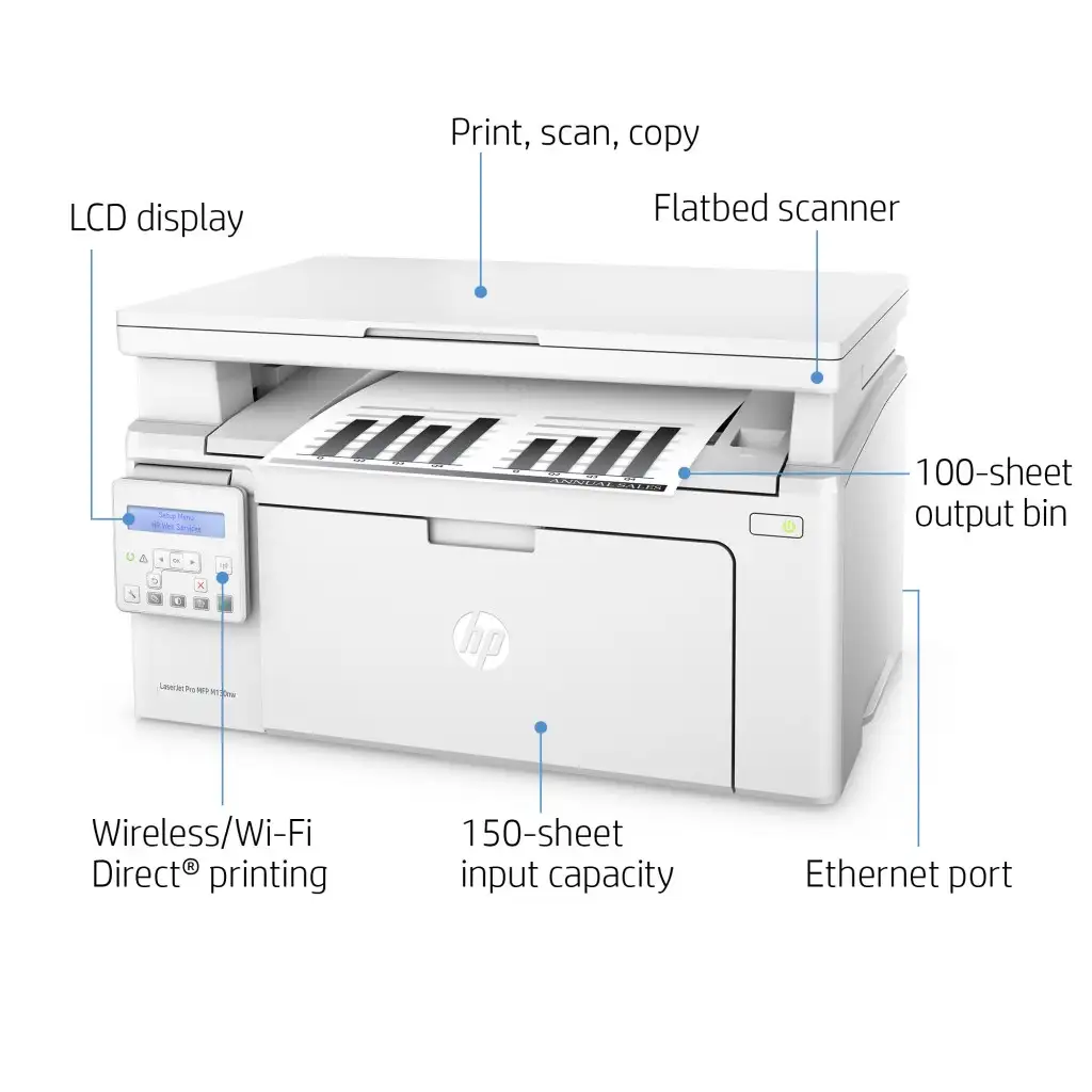 HP LaserJet Pro M130nw. Printimistehnoloogia: Laser, Printimine: Mono printing. Maksimaalne resolutsioon: 1200 x 1200 DPI. Kopeerimine: Mono copying. Maksimaalne kopeerimisresolutsioon: 600 x 400 DPI. Skaneerimine: Värviskaneerimine. Optilise skaneerimise resolutsioon: 1200 x 1200 DPI. Maksimaalne ISO A-seeria paberi suurus: A4. Standardne sisestusvõimsus: 150 lehte. Standardne väljundvõimsus: 100 lehte. WiFi. Otseprintimine. Toote värv: Valge