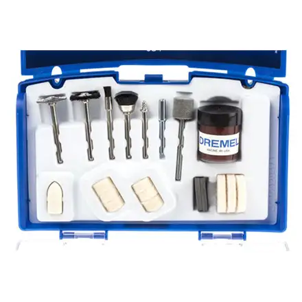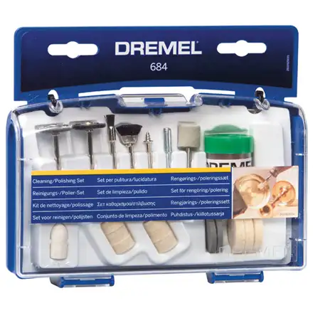 | Tarvikud kaasa arvatud | Bristle brush 19mm, Bristle brush 13mm, Bristle brush 3.2mm, Carbon steel brush, Impregnated polishing wheel, 6x Polishing wheel 13mm, Polishing point 10mm, 2xPolishing wheel 22.5mm, 3xPolishing wheel 26mm, Polishing compound, 2x Mandrel. |