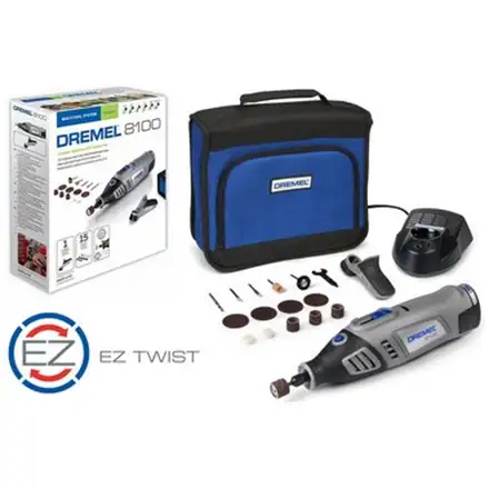 | Box contents | Dremel 8100; 15 high quality Dremel accessories; Detailer's Grip attachment; 1-Hour battery charger; Instruction manual; Soft bag. |