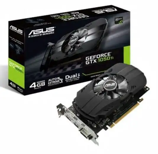 ASUS PH-GTX1050TI-4G. Graafikaprotsessorite pere: NVIDIA, Graafikaprotsessor: GeForce GTX 1050 Ti, Protsessori sagedus: 1290 MHz. Eraldiseisva graafikakaardi mälu: 4 GB, Graafikaadapteri mälutüüp: GDDR5, Mälusiin: 128 bitti, Mälu taktsagedus: 7008 MHz. Maksimaalne resolutsioon: 7680 x 4320 pikslit. OpenGL-i versioon: 4.5. Liidese tüüp: PCI Express 3.0. Jahutuse tüüp: Aktiivne
