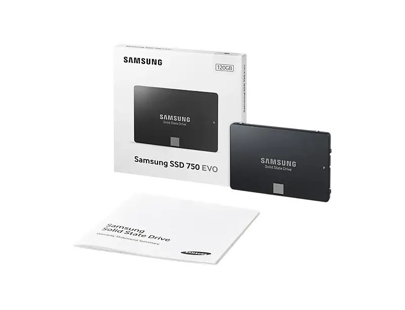 Samsung SSD 750 EVO SATA III 120GB. Pooljuhtketta maht: 120 GB, Pooljuhtketta liides: Jada ATA III, Lugemise kiirus: 540 MB/s. SSD-ketta mõõtmed: 2.5", Toote värv: Must. Võimsustarve (lugemisel): 2,1 W, Võimsustarve (kirjutamisel): 2,4 W. Laius: 10 cm, Sügavus: 6,8 mm, Kõrgus: 6,99 cm