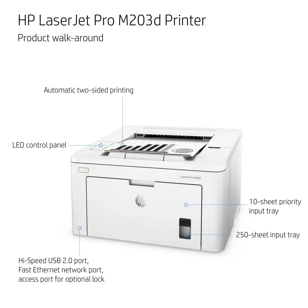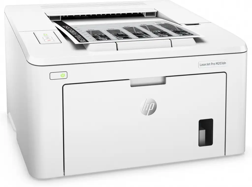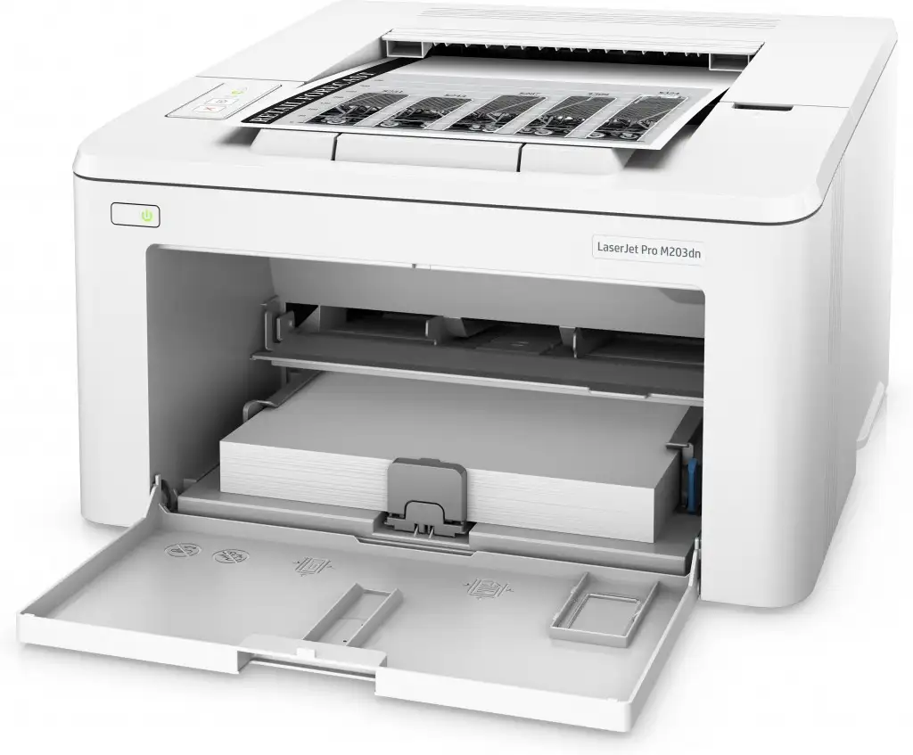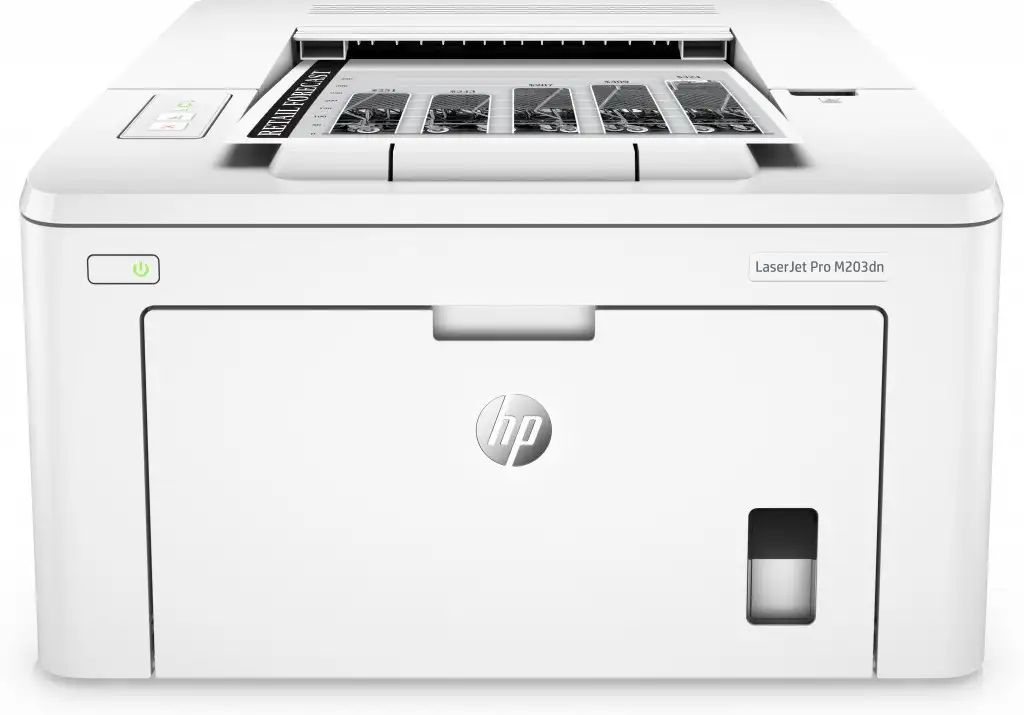 HP LaserJet M203dn. Printimistehnoloogia: Laser, Prindikassettide arv: 1, Maksimaalne käidutsükkel: 30000 lehekülge kuu kohta. Maksimaalne resolutsioon: 1200 x 1200 DPI. Maksimaalne ISO A-seeria paberi suurus: A4. Printimiskiirus (must-valge, tavakvaliteet, A4/US Letter-formaat): 28 lk/min. Standardne sisestusvõimsus: 260 lehte, Standardne väljundvõimsus: 150 lehte. Kahepoolne printimine. Ekraan: LED. Võrguvalmidus. Toote värv: Valge