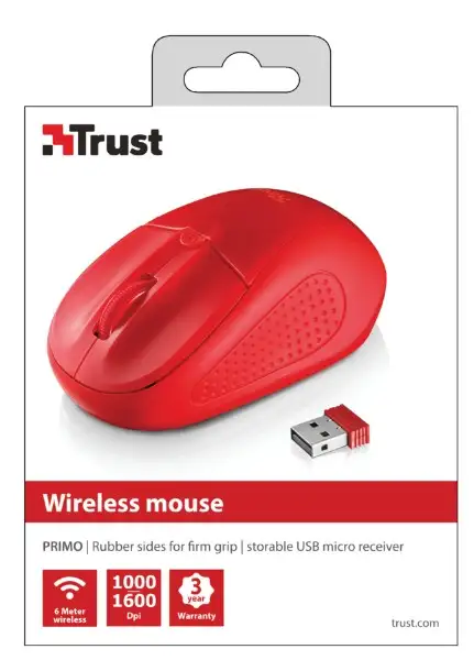 Trust 20787. Toote kuju: Mõlemakäeline. Liikumistuvastuse tehnoloogia: Optiline, Seadme liides: Raadioside, Liikumise resolutsioon: 1600 DPI, Klahvide tüüp: Sissevajutatavad nupud, Skrolli tüüp: Ratas. Toiteallikas: Patareid. Toote värv: Punane